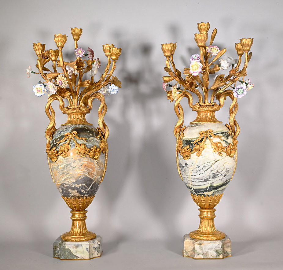 à six feux en bronze doré et patiné représentant un ange et une vestale